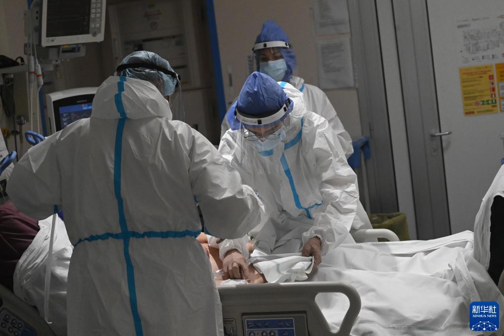 12月3日,医务人员在意大利博洛尼亚一家医院的新冠隔离区对患者进行治疗。