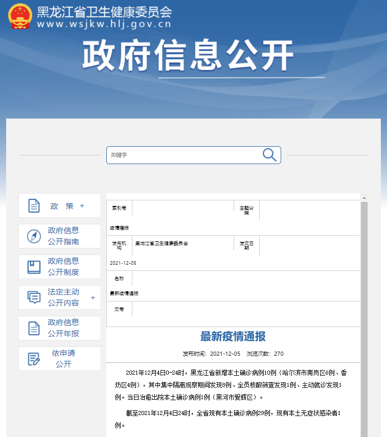 2021年12月4日0-24时,黑龙江省新增本土确诊病例10例(哈尔滨市南岗区6例、香坊区4例),其中集中隔离观察期间发现8例、全员核酸筛查发现1例、主动就诊发现1例。当日治愈出院本土确诊病例1例(黑河市爱辉区)。