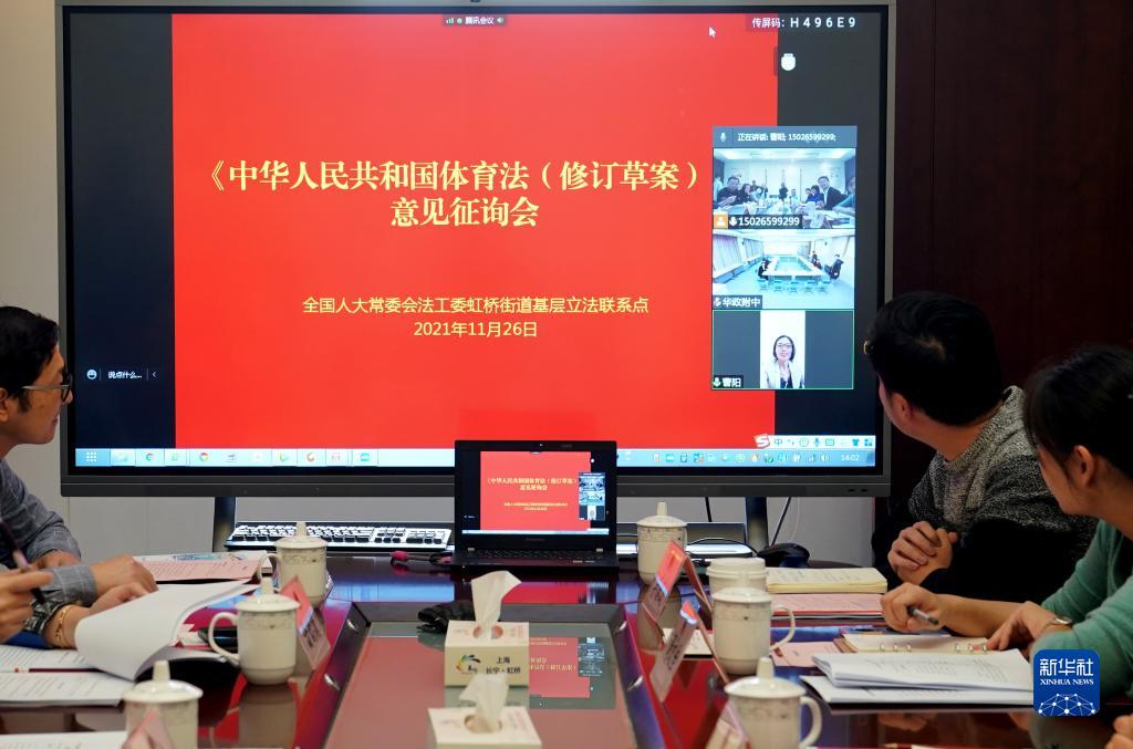 在虹桥街道基层立法联系点召开的《中华人民共和国体育法(修订草案)》意见征询座谈会上,长桌边有基层体育工作者、运动员、高校老师等;长桌一头,一块屏幕将讨论过程直播给全国人大常委会法工委相关工作人员,以及华东政法大学附属中学的学生。