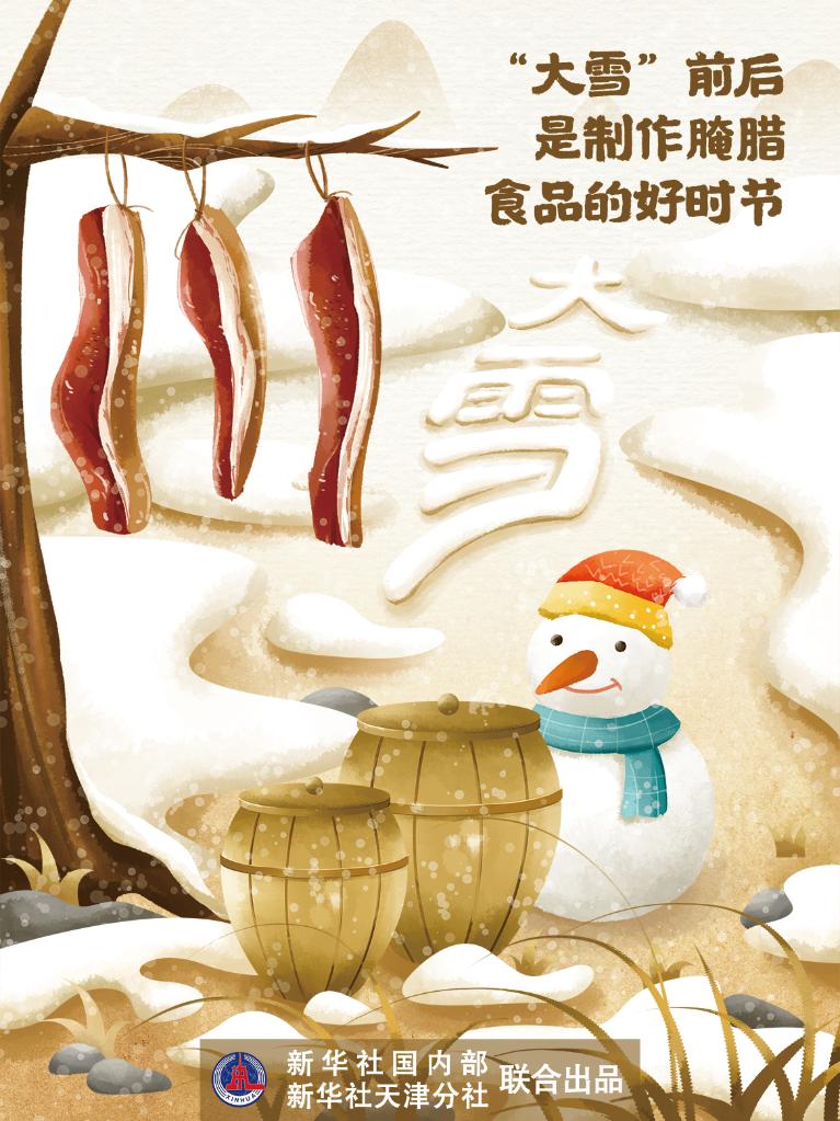 “大雪”前后是制作腌腊食品的好时节。“人们把肉、禽、鱼等精心腌制后,风干保存,待春节时享用。”罗澍伟说。
