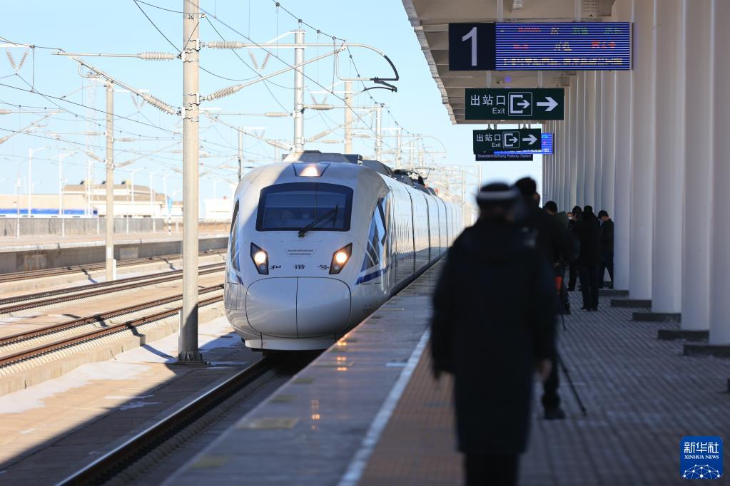 12月5日,动车组列车驶入兰新高铁山丹马场站。新华社发(王超 摄)