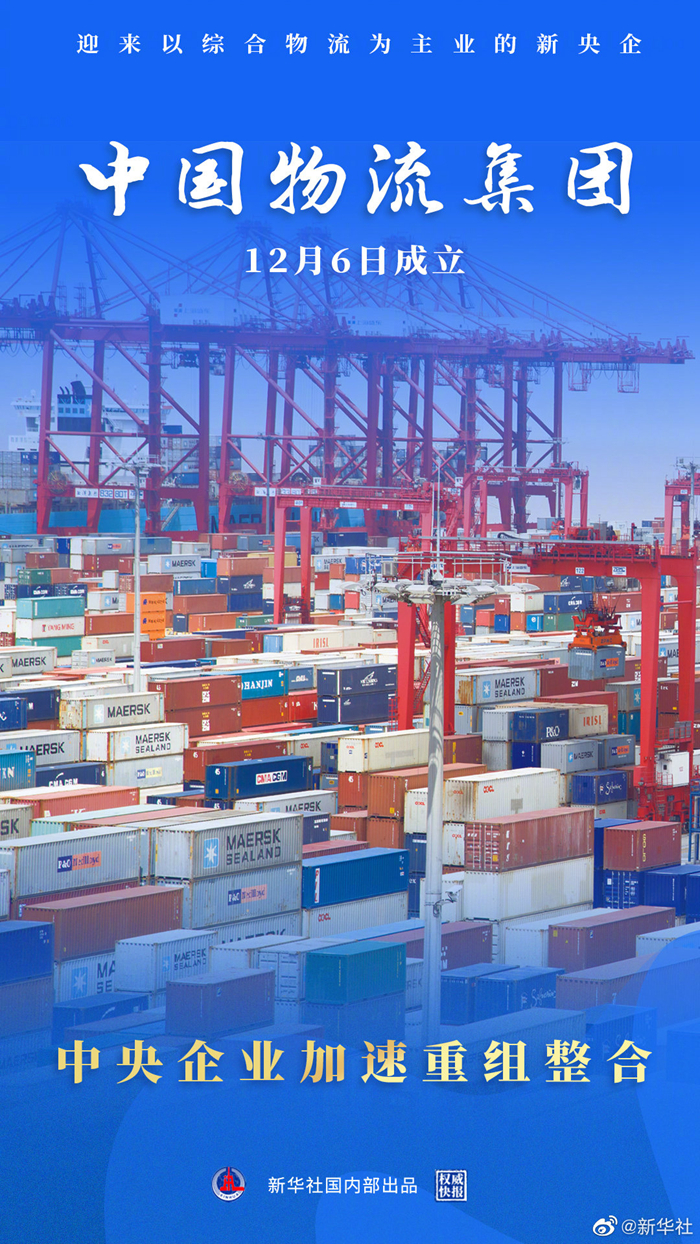 中央企业专业化整合再下一城!经国务院批准,中国物流集团有限公司12月6日正式成立。这家以综合物流为主业的新央企,以原中国铁路物资集团有限公司与中国诚通控股集团有限公司物流板块为基础实施专业化整合,并同步引入东方航空、中国远洋海运、招商局集团作为战略投资者,实现股权多元化。(记者齐中熙、王希,海报设计张晨光)
