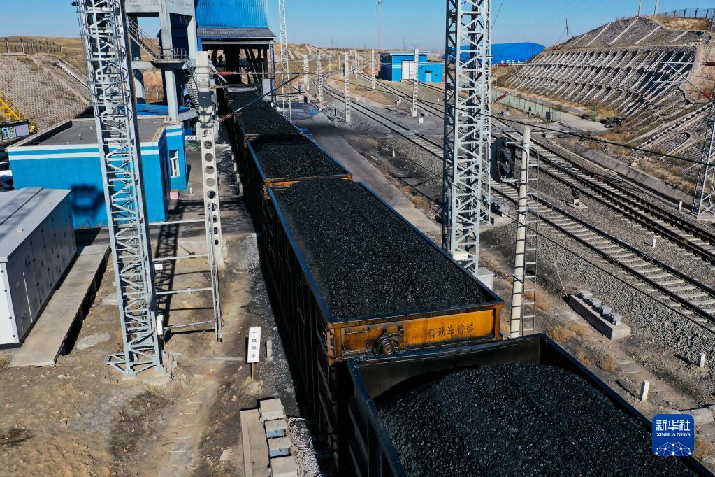 这是11月23日在位于内蒙古鄂尔多斯市淮河能源西部煤电集团色连二矿罕台川集装站拍摄的正在装煤的列车(无人机照片)。新华社记者 李志鹏 摄