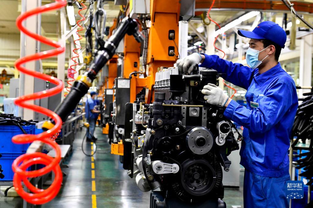 在位于山东潍坊的潍柴集团总装车间,工人在流水线上装配发动机(4月22日摄)。新华社记者 郭绪雷 摄