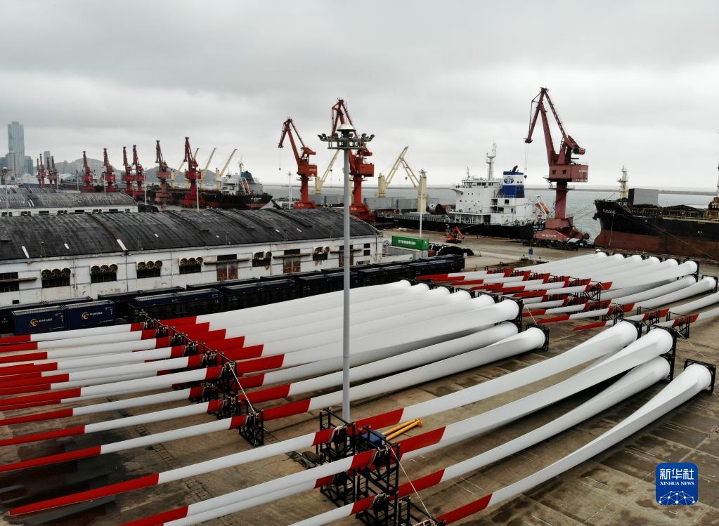 一批风电叶片排放在江苏连云港一码头等待装船(7月27日摄,无人机照片)。新华社发(王春 摄)