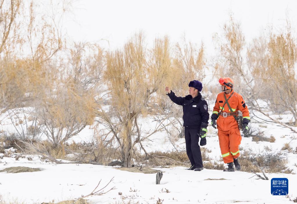 乌苏市甘家湖林场五道泉管护站站长木拉提·哈尼(左)和甘家湖林场应急分队队员帕勒哈提·叶勒肯正在查看白梭梭林生长情况(12月4日摄)。