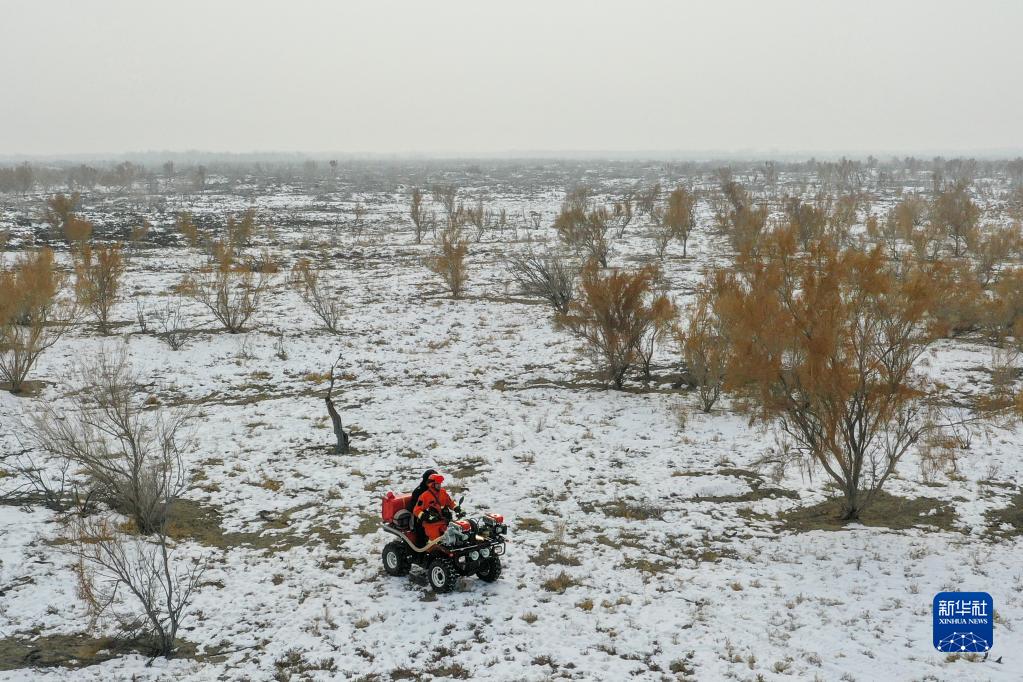 乌苏市甘家湖林场的管护人员在巡逻中(12月4日摄,无人机照片)。