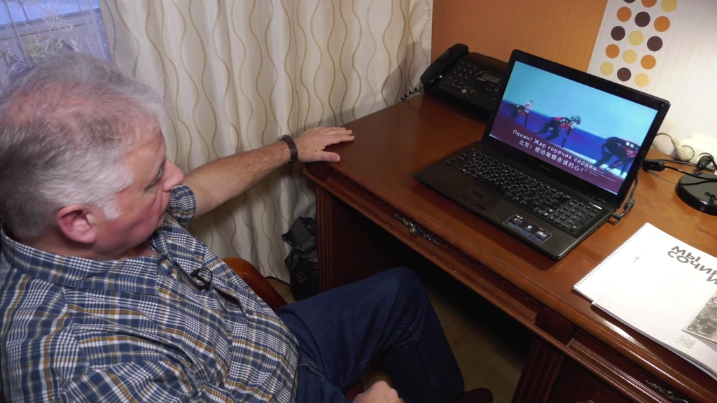 弗拉基米尔·沃罗比约夫观看由他创作的以北京冬奥会为主题的俄语歌曲《北京》。(视频截图)