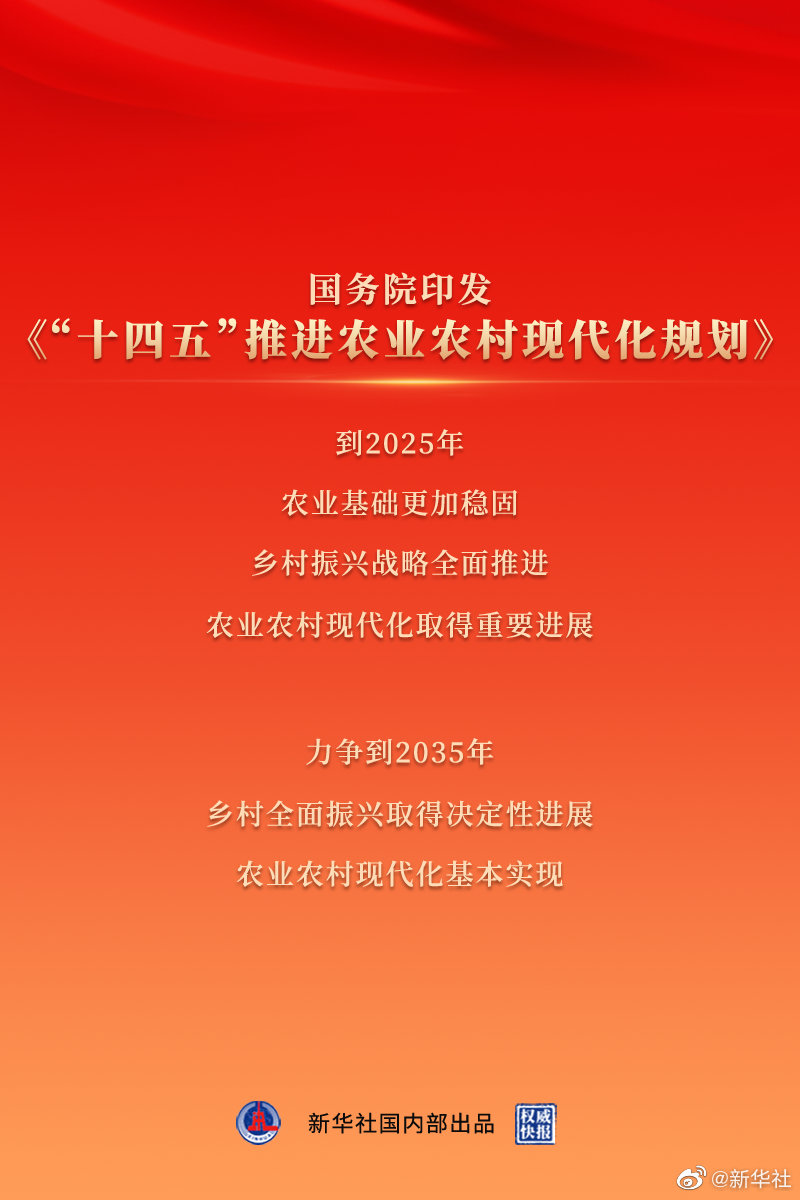 农业农村部副部长邓小刚8日表示,近日国务院印发《“十四五”推进农业农村现代化规划》。规划提出,到2025年,农业基础更加稳固,乡村振兴战略全面推进,农业农村现代化取得重要进展。梯次推进有条件的地区率先基本实现农业农村现代化,脱贫地区实现巩固拓展脱贫攻坚成果同乡村振兴有效衔接。力争到2035年,乡村全面振兴取得决定性进展,农业农村现代化基本实现。(记者于文静、王悦阳,海报设计杨轶群)