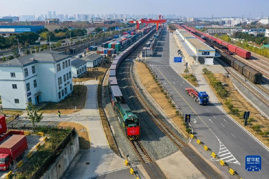 12月8日,“江苏号”中老铁路国际货运列车从中国铁路上海局集团有限公司南京货运中心尧化门铁路货场发车(无人机照片)。新华社记者 李博 摄