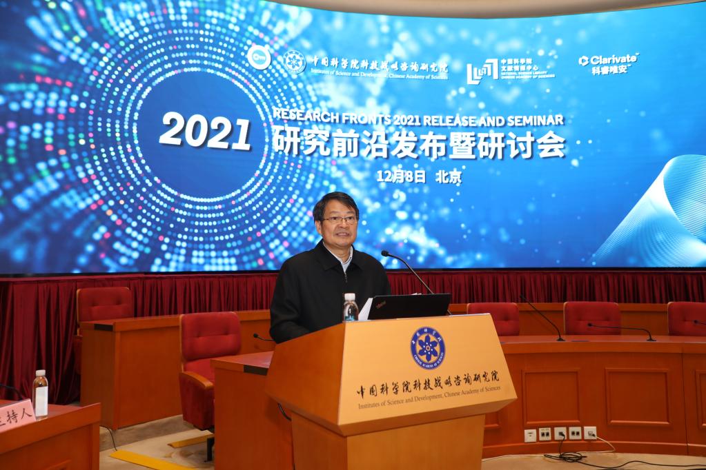 中国科学院副院长高鸿钧在2021研究前沿发布暨研讨会上致辞。(中科院科技战略咨询研究院 供图)