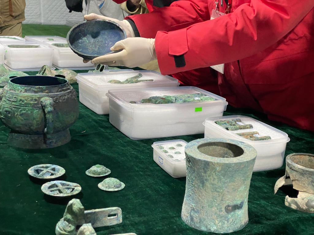 新出土的青铜面具、兽面形铜饰、成组的铜车马器、镂空有銎铜戈,纹饰精美、细节丰富,呈现出多元的文化因素。出土的多件漆器,包括三角纹簋、豆等,对于墓葬随葬器用制度的研究具有重要意义。