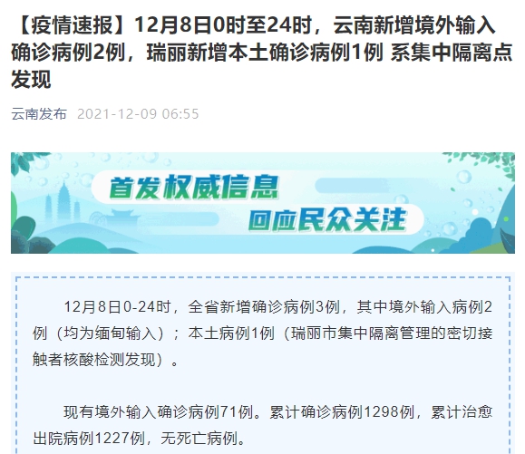 12月8日0-24时,全省新增确诊病例3例,其中境外输入病例2例(均为缅甸输入);本土病例1例(瑞丽市集中隔离管理的密切接触者核酸检测发现)。