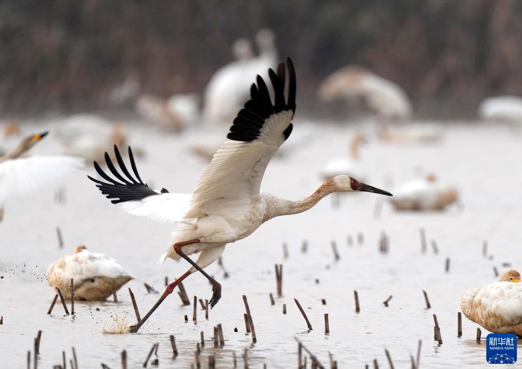 在江西南昌高新区鲤鱼洲管理处五星白鹤保护小区,白鹤在湿地中展翅起飞(12月8日摄)。