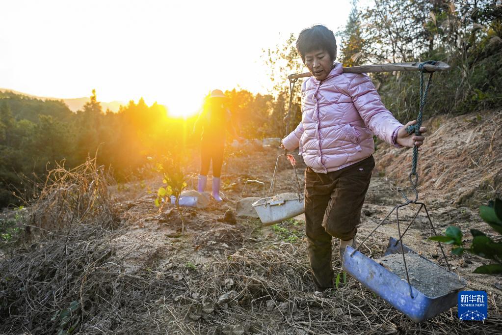 11月23日,马雪梅把粪肥挑上山。新华社发(周义摄)