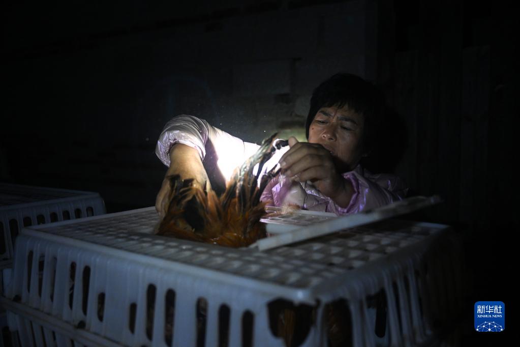 11月23日,马雪梅在养鸡场把鸡装笼,准备运送给收购公司。新华社发(周义摄)