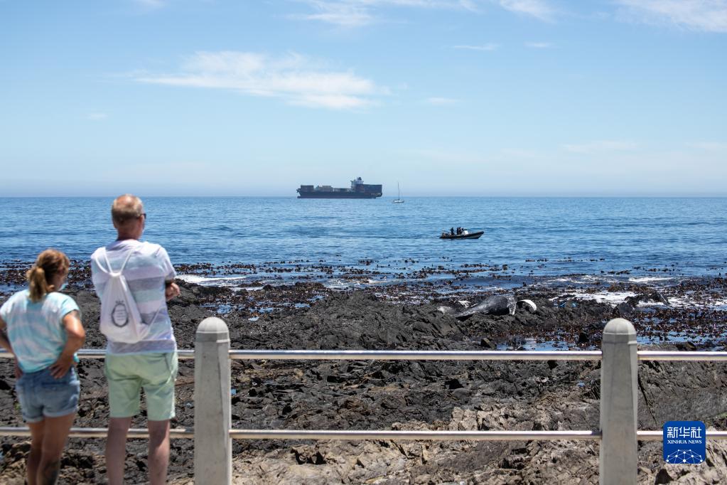 12月9日,人们在南非开普敦的海岸边观看工作人员搬运座头鲸尸体。