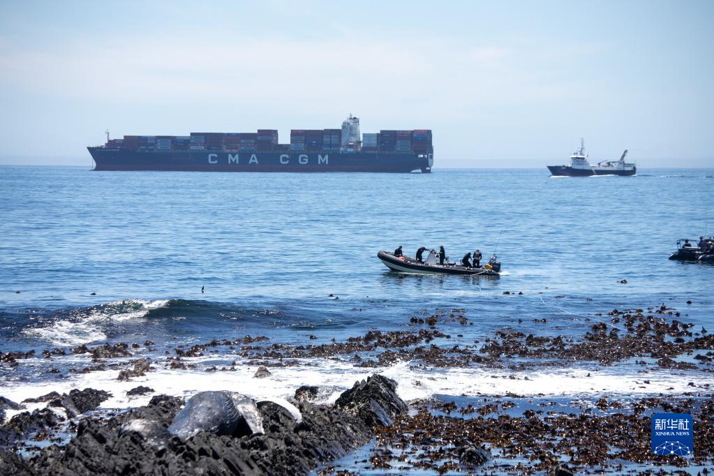 12月9日,在南非开普敦,工作人员准备转移海岸边的座头鲸尸体。