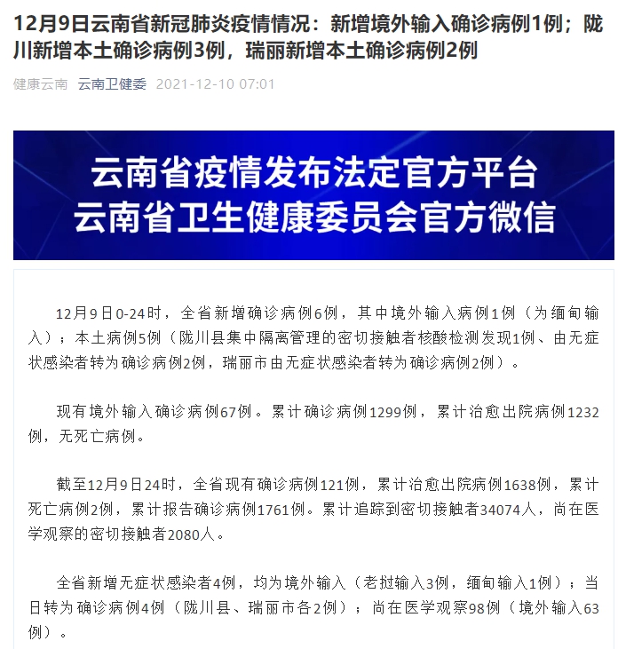 12月9日云南省新冠肺炎疫情情况:新增境外输入确诊病例1例;陇川新增本土确诊病例3例,瑞丽新增本土确诊病例2例