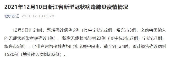 12月9日0-24时,新增确诊病例6例(其中宁波市2例,绍兴市3例,之前韩国输入的无症状感染者转确诊1例),新增无症状感染者23例(其中杭州市7例,宁波市7例,绍兴市9例),已排查密切接触者均已实施集中隔离。截至9日24时,累计报告确诊病例1528例(境外输入病例282例)。
