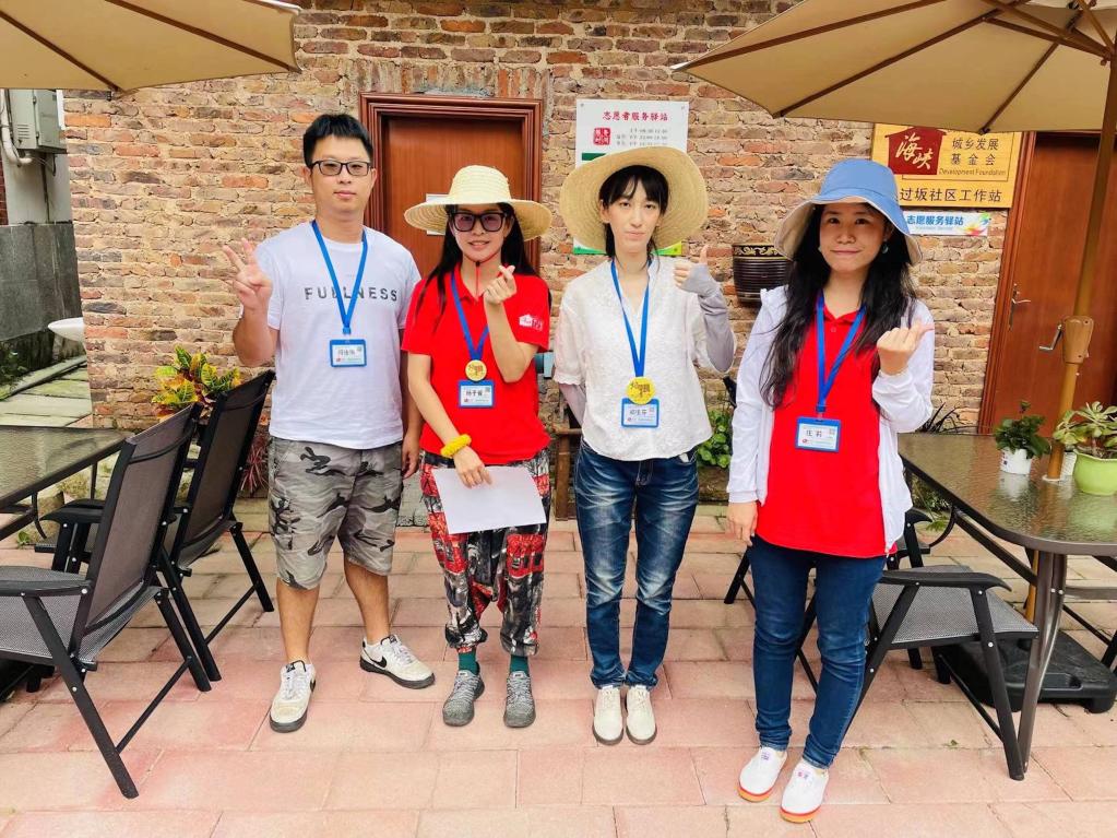 台青社区营造员杨于萱(左二)在驻点的厦门海沧过坂村内与村民合影。(受访者供图)