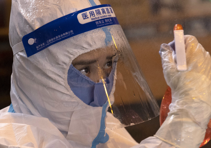取消毒剂洗手、准备试剂管、用棉签采样……在哈尔滨市香坊区中北春城小区的一个核酸检测点,每个动作,护士刘娟都得重复六七百次。