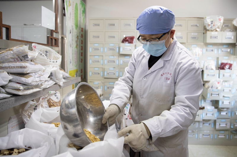 12月7日,在哈尔滨市道里区中医医院,工作人员在调配中药用料。(新华社记者张涛 摄)