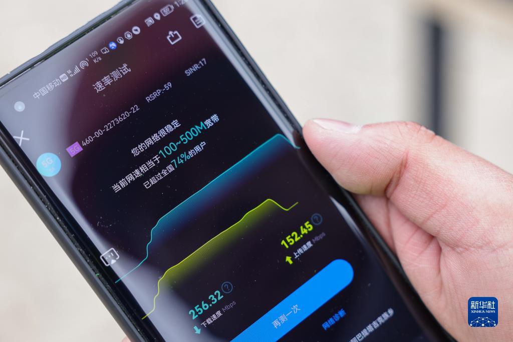 在新疆首个高原5G基站开通现场,设备维护人员测试5G网络速度(12月9日摄)。新华社记者 丁磊 摄