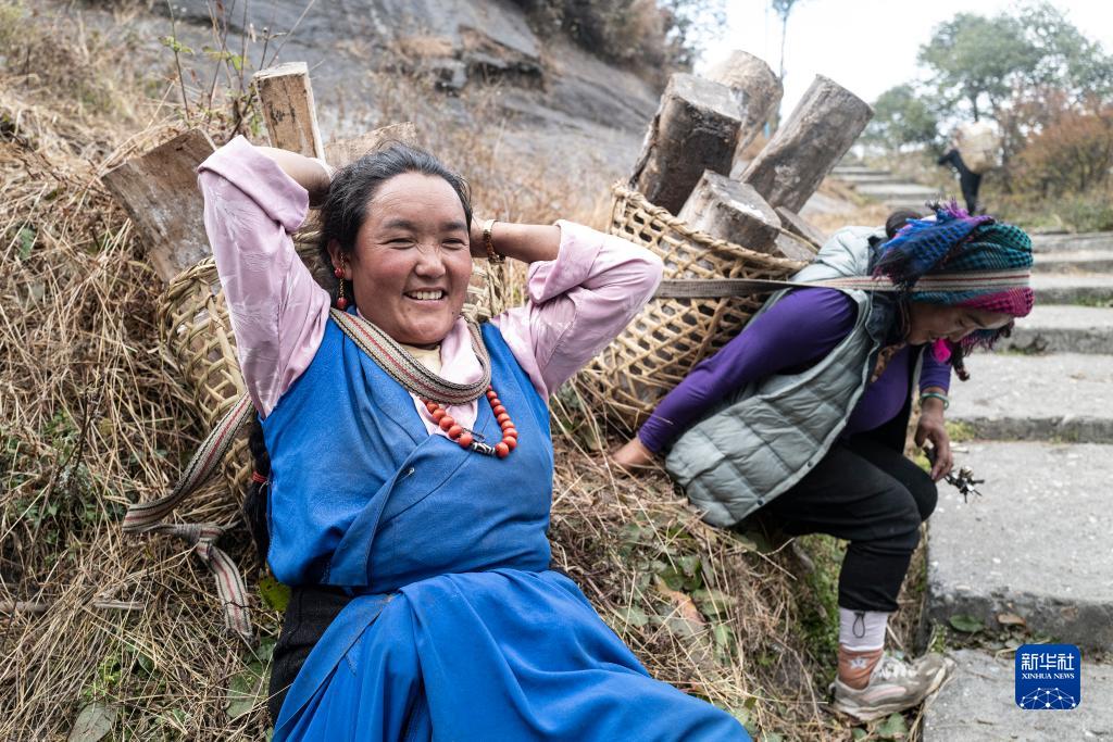 陈塘镇夏尔巴妇女沿着石板路拾级而上运送物资(11月24日摄)。