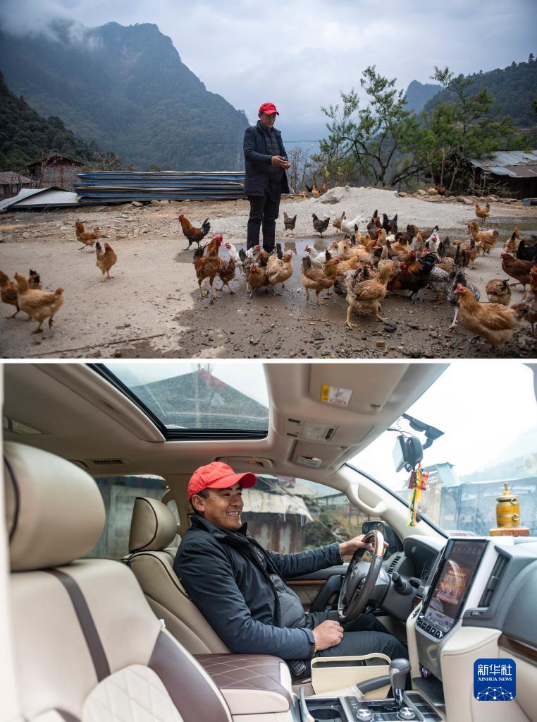 拼版照片:上图为陈塘镇的致富带头人拉巴塔杰给养鸡场的散养鸡喂食;下图为拉巴塔杰坐在自己致富后购买的越野车内(均为11月25日摄)。
