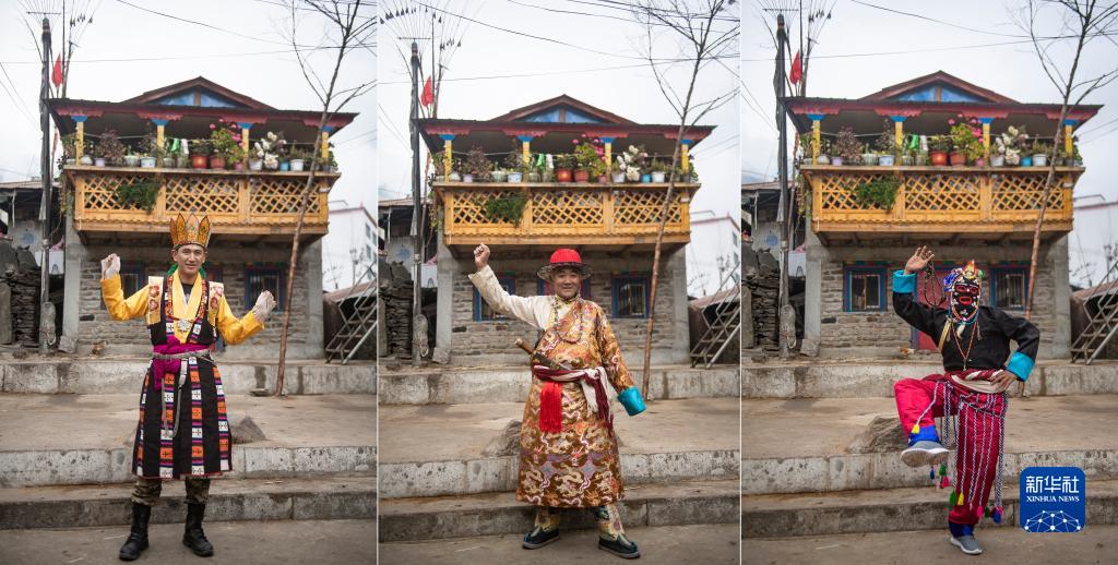 拼版照片:三位陈塘镇的藏戏演员在平时演出的戏台处展示表演时的动作(11月25日摄)。