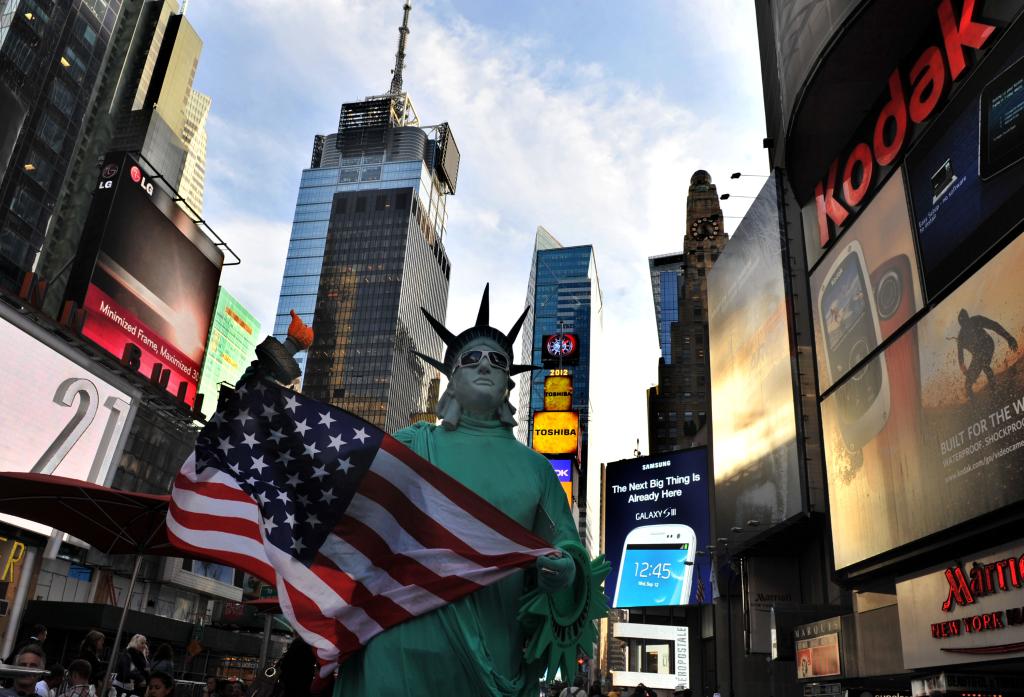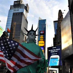 2012年10月9日,在美国纽约,一名装扮成自由女神像的旅游从业者在纽约时报广场招揽过往游客合影。(新华社记者王雷摄)