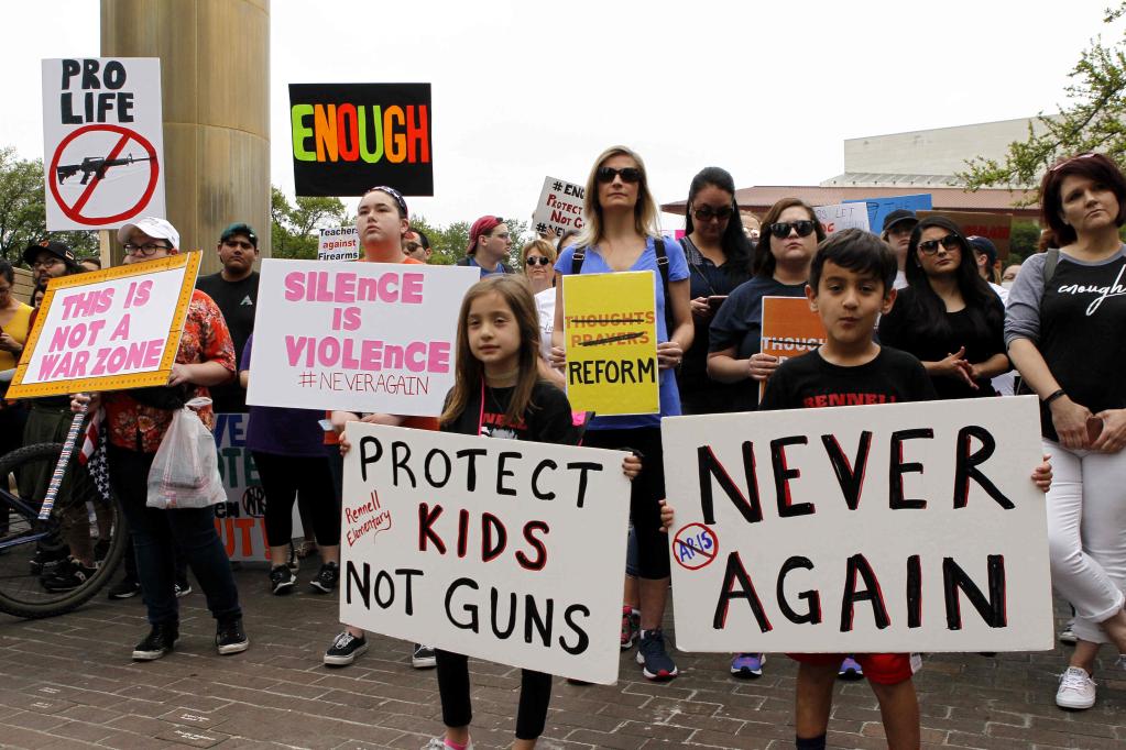 2018年3月24日,全美学生、教师、家长等在数百个城镇举行游行,呼吁加强枪支管控,遏制枪支暴力,提升校园安全,同时要求政客不要接受美国全国步枪协会等团体的政治献金。图为民众在休斯敦参加集会。(新华社发,宋穹摄)