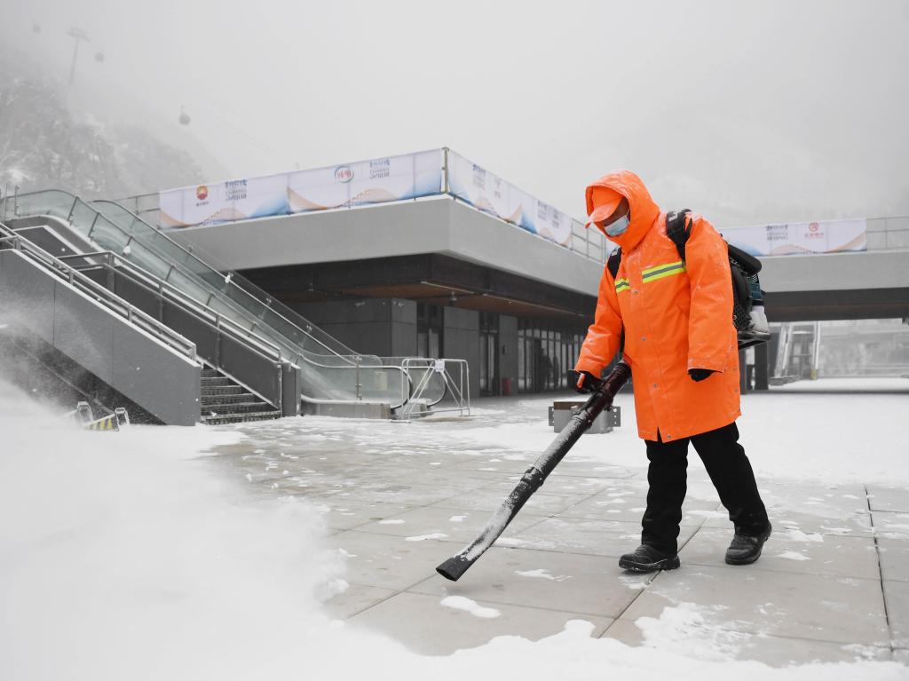 资料图:延庆赛区国家高山滑雪中心的工作人员正在清扫积雪。新华社记者 张晨霖 摄