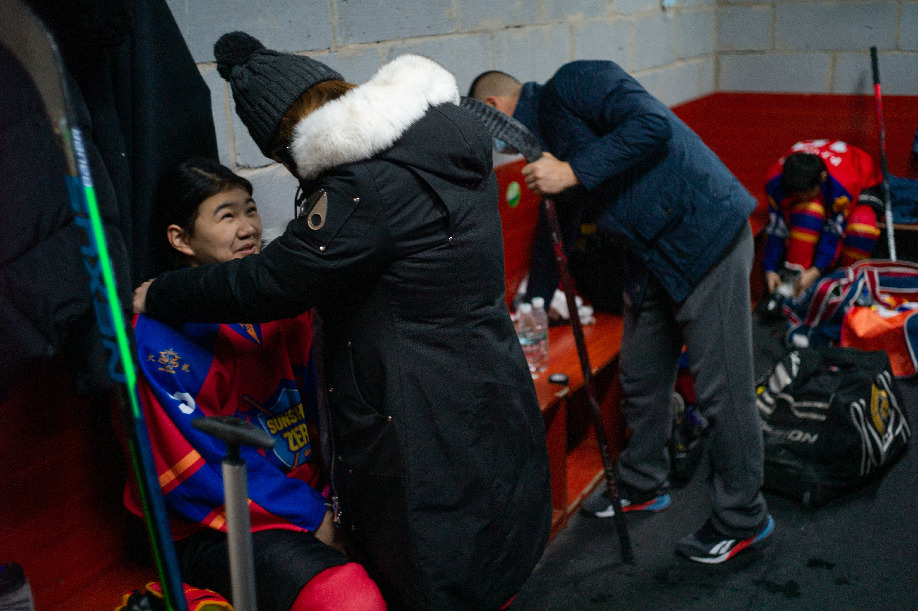 ↑12月11日,北京火龙09队的一名球员赛前在更衣室与母亲交流。新华社记者 吴壮 摄