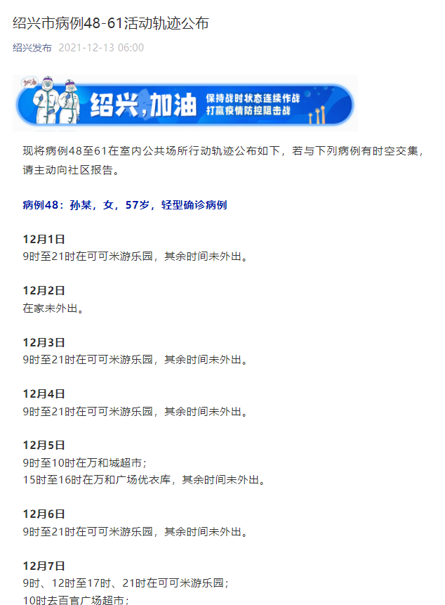 现将病例48至61在室内公共场所行动轨迹公布如下,若与下列病例有时空交集,请主动向社区报告。