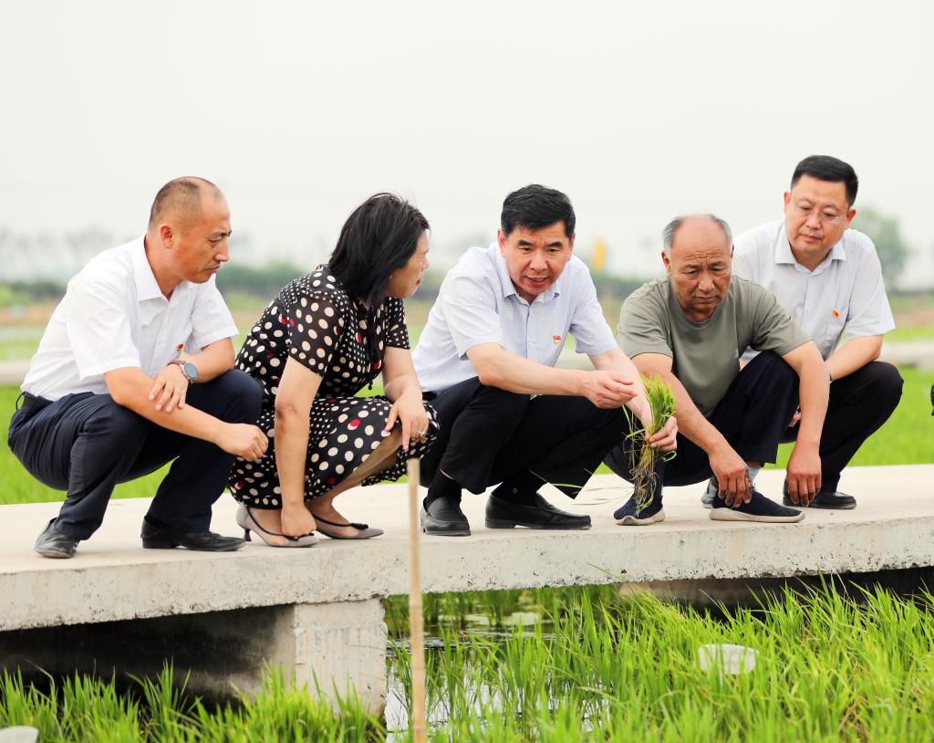 7月2日,在东营市垦利区一邦农业公司耐盐碱水稻实验基地,垦利区委书记刘斯杰(中)和企业负责人察看水稻长势。新华社发(程永锋摄)