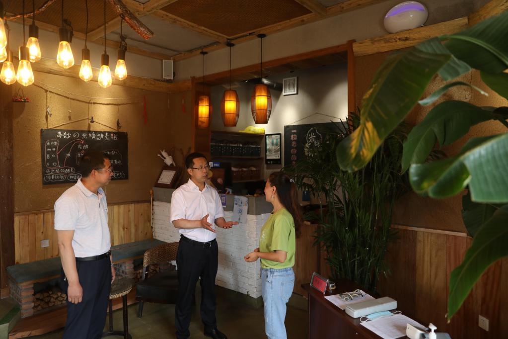 7月2日,在沈阳市沈北新区兴隆台街道单家村,闻然(中)在调研民宿发展情况。新华社记者杨青摄