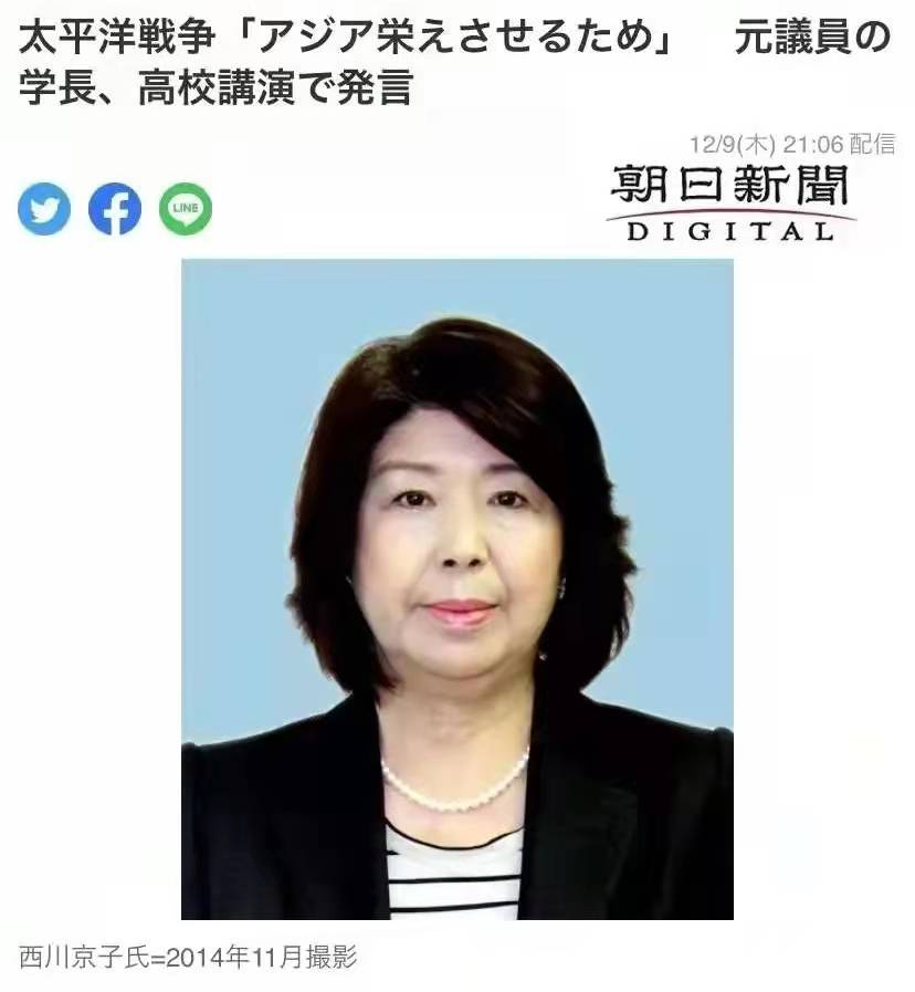 在这场现场及线上听众共计近500人的演讲中,西川京子竟将日本对中国等亚洲国家的侵略战争称为“大东亚战争”,将其形容为“促进亚洲整体繁荣和独立”的战争。