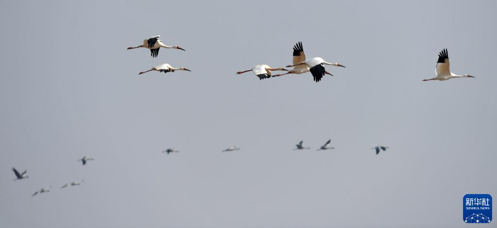 候鸟飞翔在余干县康山垦殖场插旗洲上空(12月10日摄)。