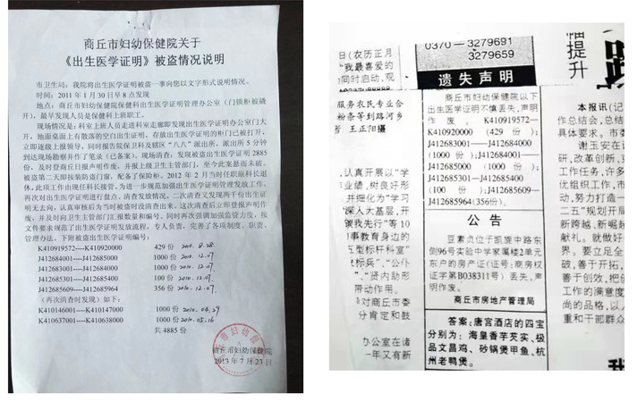 这是一张拼版图片:图左为商丘市妇幼保健院2013年7月23日向商丘市卫生局报告的被盗情况说明,图右为刊登在《商丘日报》上的一批出生医学证明丢失的作废声明。 上官正义提供