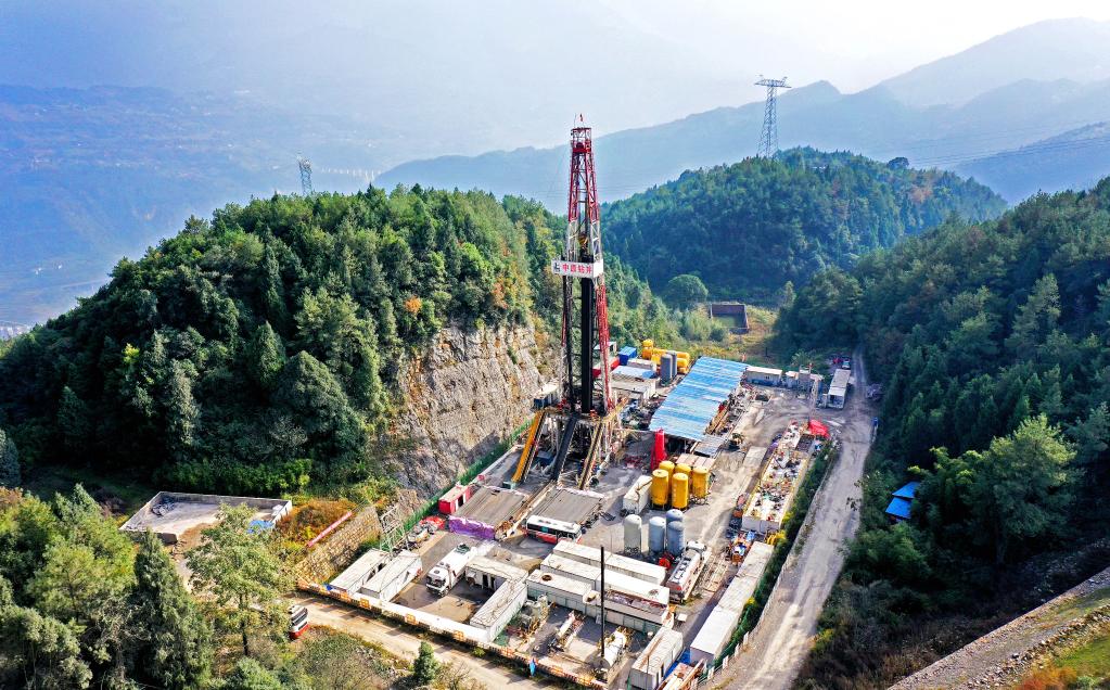 图为中国石化涪陵页岩气田白马区块钻进中的143号平台。(涪陵页岩气田供图)