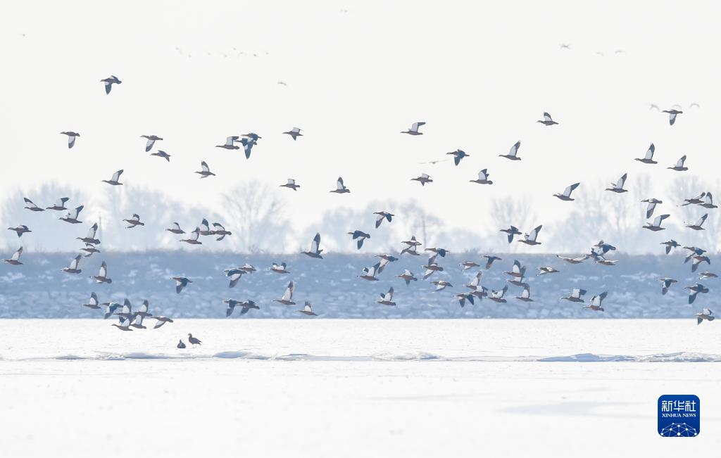 正值冬日,在呼和浩特土默特左旗海流水库,四五千只赤麻鸭栖息在此,为海流水库增添了勃勃生机。