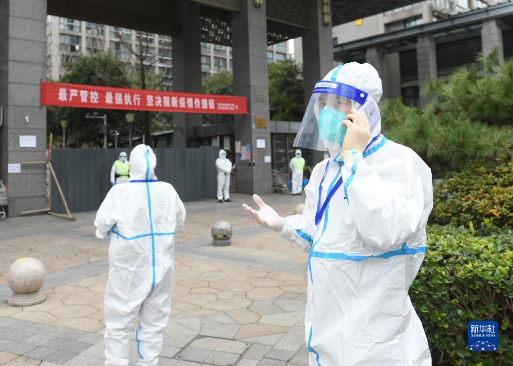 12月14日,工作人员在发现上虞首例确诊病例的阳光假日小区紧张工作。