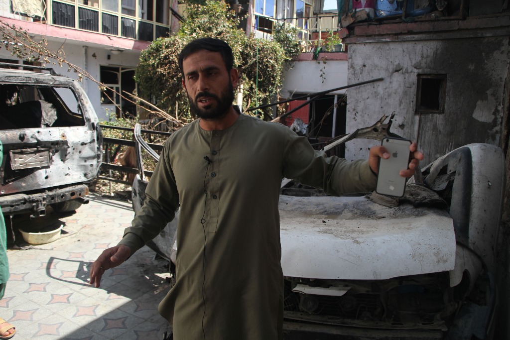 9月2日,在阿富汗喀布尔一处被美军空袭过的居民区,一名空袭遇难者的亲属站在汽车残骸旁。(新华社发,塞夫拉赫曼·萨菲摄)