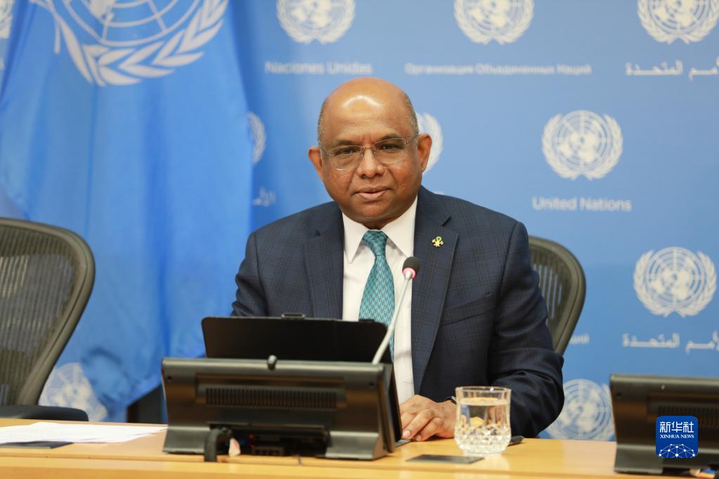 12月14日,第76届联合国大会主席阿卜杜拉·沙希德出席在纽约联合国总部举行的记者会。新华社记者 谢锷 摄