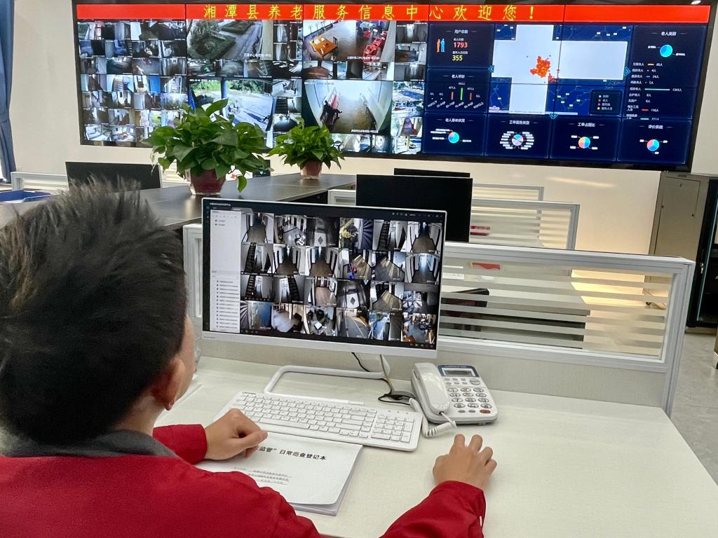 湘潭县养老服务信息中心工作人员正查看服务范围内养老机构的监控视频。新华社记者苏晓洲摄