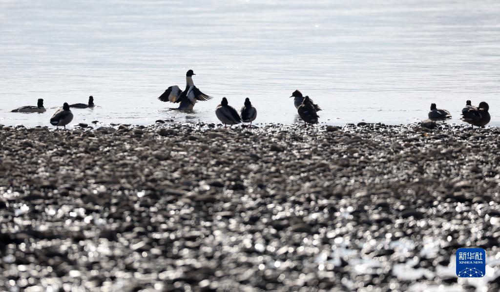 候鸟栖息在甘肃省定西市岷县洮河湿地(12月14日摄)。