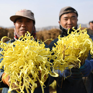 12月15日,在兰州市西固区张家大坪村,农民展示刚收割的韭黄。