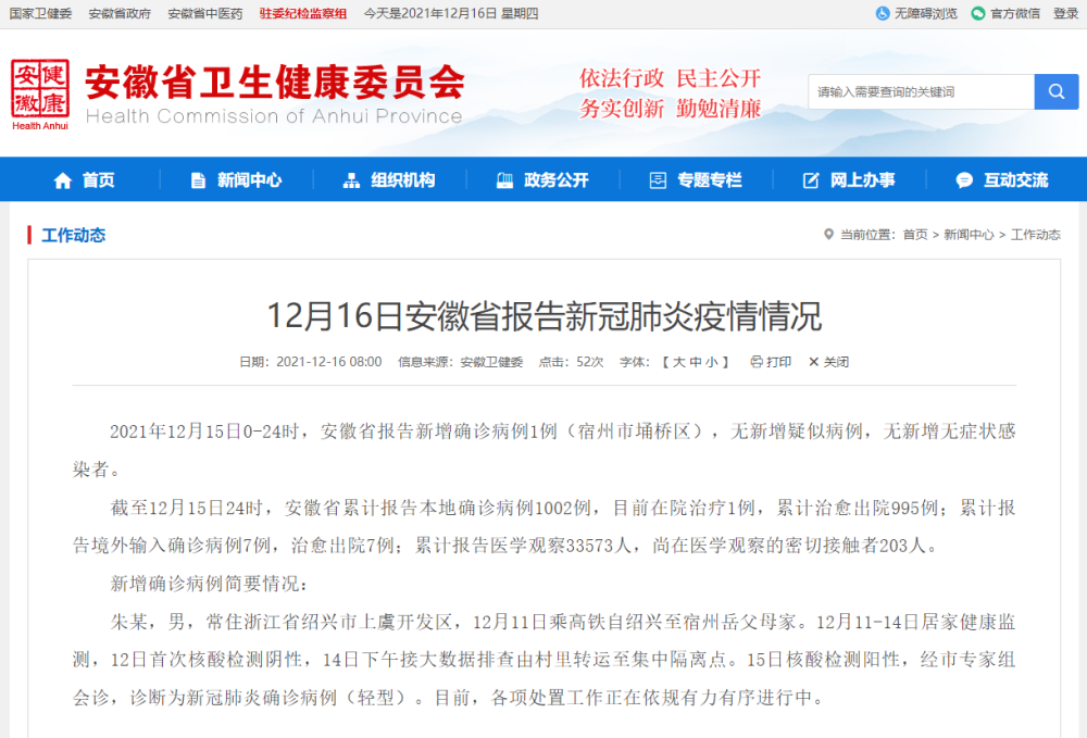 2021年12月15日0-24时,安徽省报告新增确诊病例1例(宿州市埇桥区),无新增疑似病例,无新增无症状感染者。